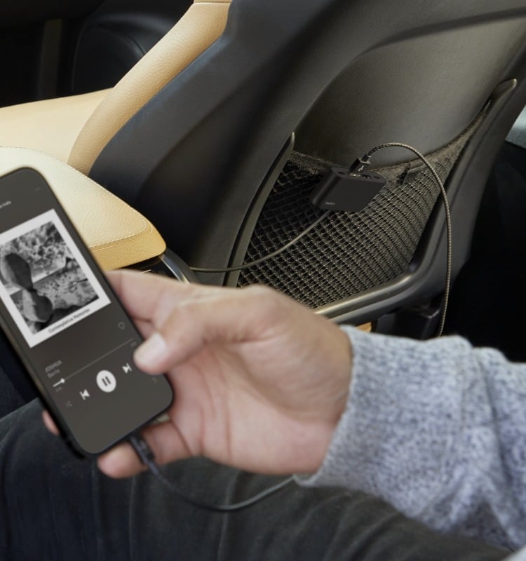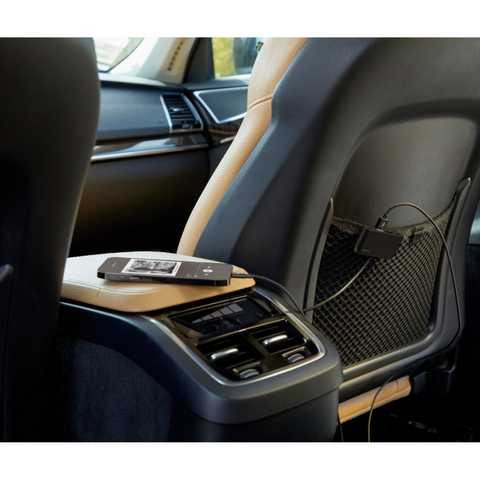 A detachable clip conveniently holds the splitter to a seat, sofa, or desk.